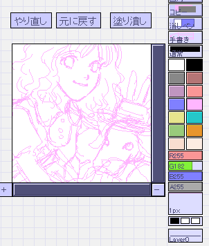 「レイヤー1」を忘れずにチェック。 「水彩」を選んで好みの色を選んで「A値241」で下書きの上をなぞって主線を描いていきます。(A値の値は好みで選んで下さい) 主線の出来具合で完成具合も変わってくるので、じっくり丁寧に。 ※作ったペンデータをここで保存できます。ペンデータを作ったらこの画面で右クリック。これでいつでも好みのペンが呼び出せます。 ※細かいところが描きやすいように私は「窓」で別ウィンドウを開き、さらに拡大して描いています。 ←拡大ボタン |